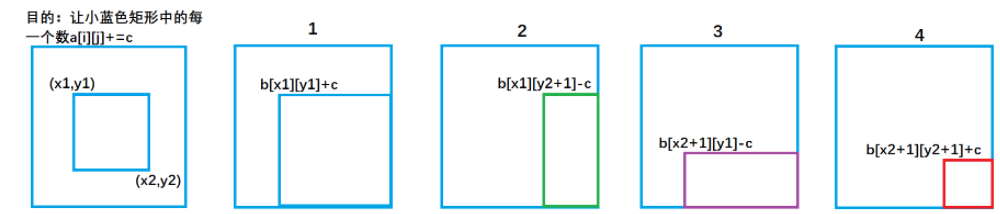对b数组进行处理,即对a数组中(x1,y1)到(x2,y2)之间的元素+c,等价于:
