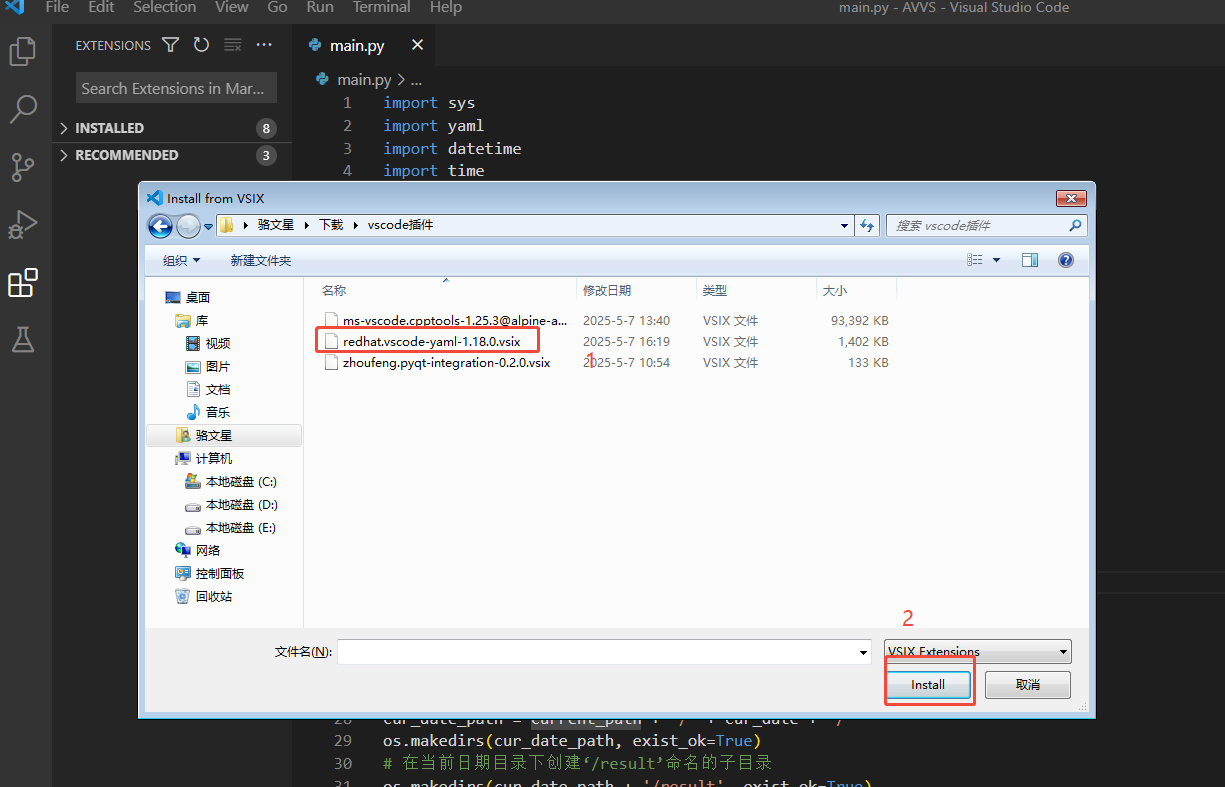 切换至前面下载好.vsix文件目录,选择对应的文件,点击“install”开始安装
