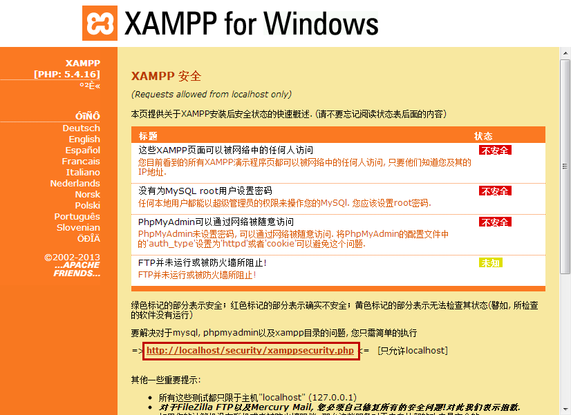 ① 在XAMPP控制面板启动Apache和MySQL的服务,点击Apache的Admin,选择语言后点击左侧的「安全」,如下图所示,可以看到目前服务器的安全状态。