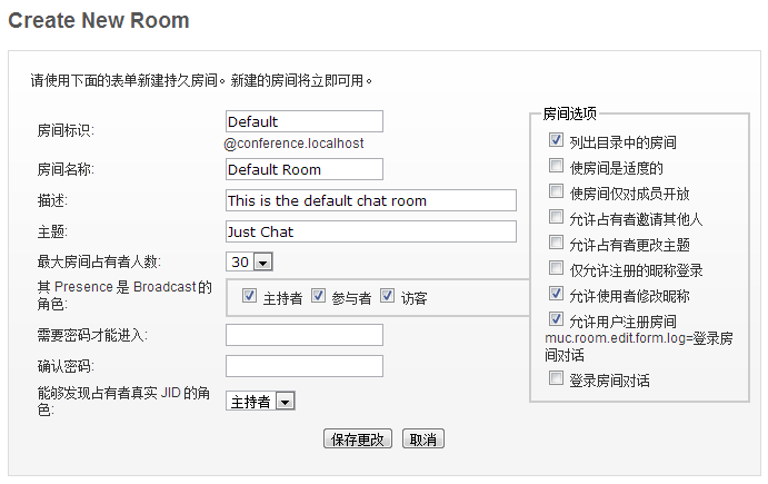 勾选「所有用户」和「自动加入」,这样登陆聊天服务器的所有人都会自动加入到「Default」这个房间。