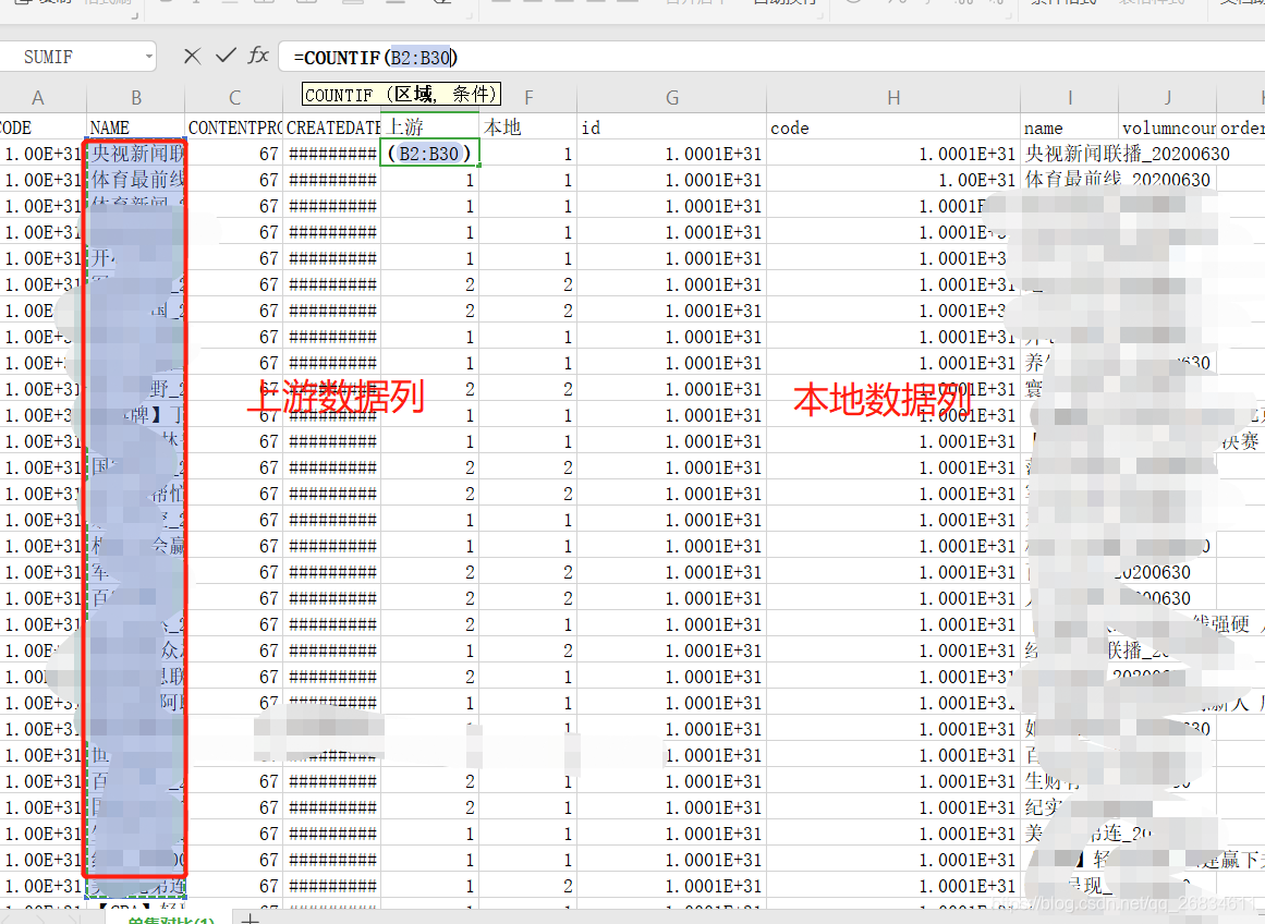 然后,按住ctrl 拉单元格右下角的+号,使得整列都出现统计值。可以弄两列,分别对比。其中B:B 代码数据区域,根据你要对比的数据进行选择,我这里选择的是B整个列,E1是要统计对比的值,解释下就是 “央视新闻联播”这条数据,是否在B这列出现过,