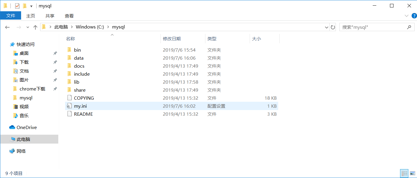 这里我创建了C:\mysql并将MySQL的文件解压进去了,目录结构如下