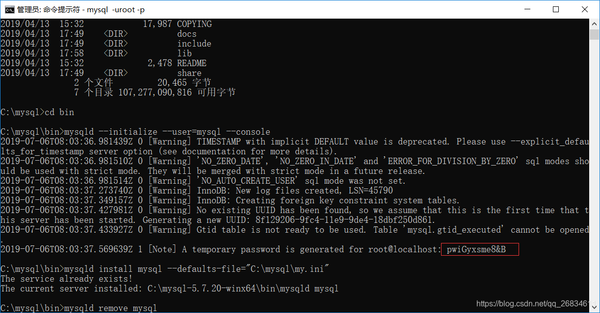 接下来开始初始化MySQL数据库。在命令控制台输入“mysqld --initialize --user=mysql --console”,回车,MySQL就开始自动进行初始化,会创建你所指定的“datadir”地址与基本数据库。稍等片刻,命令执行完毕,会生成root用户和临时密码,执行记录中“root@localhost”后的随机字符串就是root的临时密码。