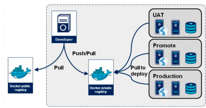 Docker Registry中的镜像通常由开发人员制作,而后推送至“公共”或“私有”Registry上保存,供其他人员使用,例如“部署”到生产环境。