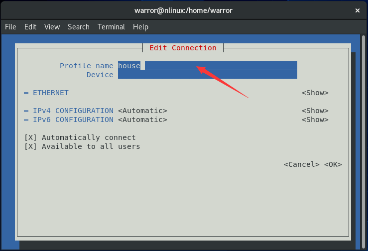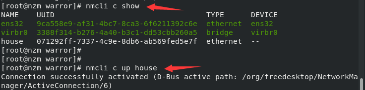 然后命令行上输入nmcli c show查看连接名,利用nmcli c up house启动连接