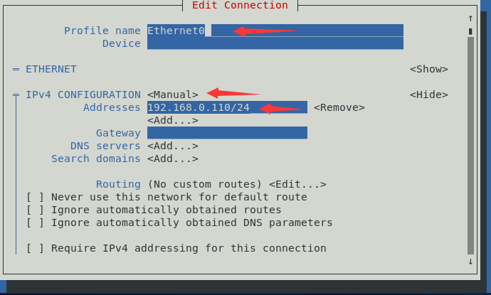 选择Edit a connection,回车,修改如下三个位置的,其中Address需要和主机的IP在同一网段下,在windows命令行下输入ipconfig查看主机的ip