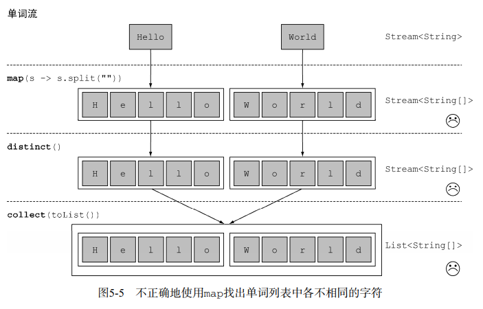 这个方法的问题在于,传递给map方法的Lambda为每个单词返回了一个String[](String列表)。因此,map返回的流实际上是 Stream<String[]> 类型的 。你真正想要的是用Stream<String>来表示一个字符流。