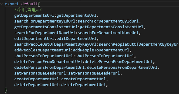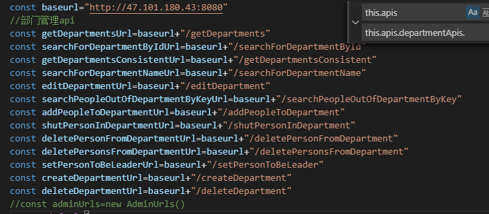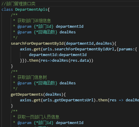 apis.js:封装具体的后端API,这里,我按照页面和功能将接口分为五个类,目前只重构了部门管理接口类