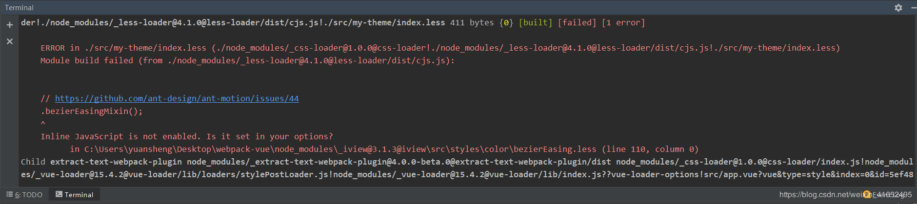 大概意思是:webpack无法解析less文件,需要安装一些css相关的解析工具