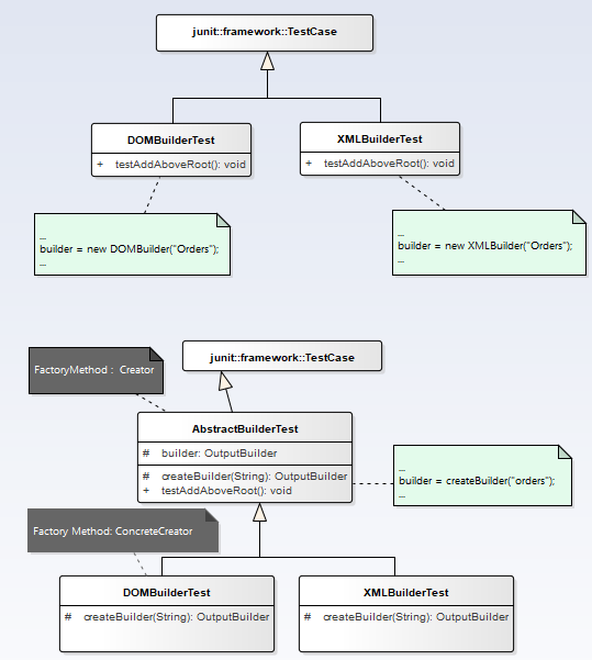 - 在相似方法上应用形成 Template Method 重构。引出对 上移方法 的应用。(上移方法:如果你使用强类型语言,且打算上移的方法调用了另一个子类中包含但超类不包含的方法,请为超类声明一个抽象方法。) 实例化方法就是这种需要声明在超类中抽象方法中的一个。现在,实现这一抽象方法的每个子类都成了 Factory Method: ConcreteCreator [DP]