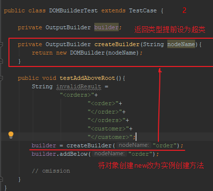 - 在包含相似方法的子类中修改这一方法,以便通过条用实例化方法来完成自定义对象的创建。通常情况:在创建代码上提炼方法或者创建代码改为对已经存在的实例方法的调用可以完成这一步。