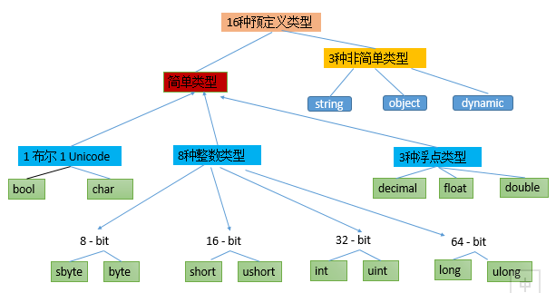 11种数值类型,1种 Unicode 字符类型 char , 1种布尔类型 bool, 3种非简单类型:string, object, dynamic