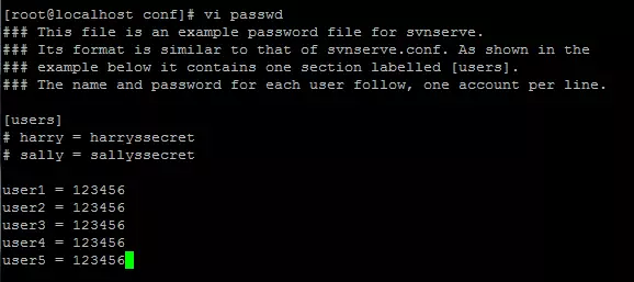 修改svnserve.conf文件 vi svnserve.conf ,取消其中几行的注释,改变配置