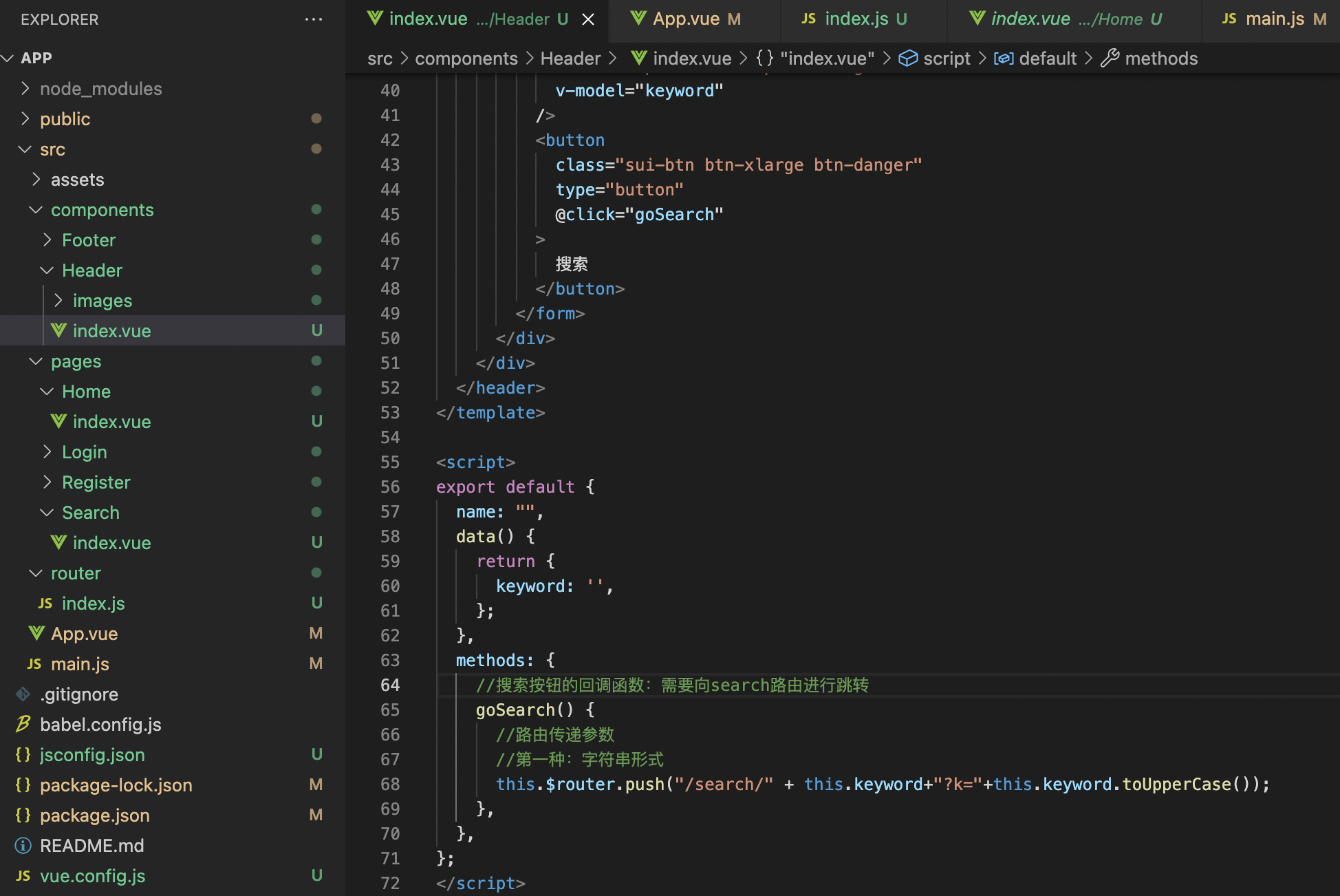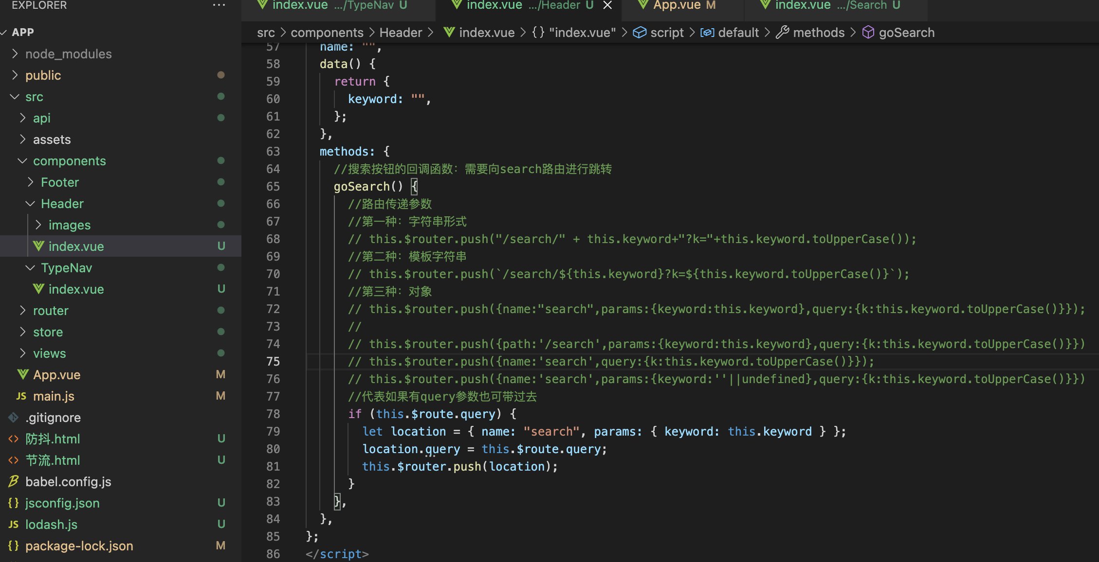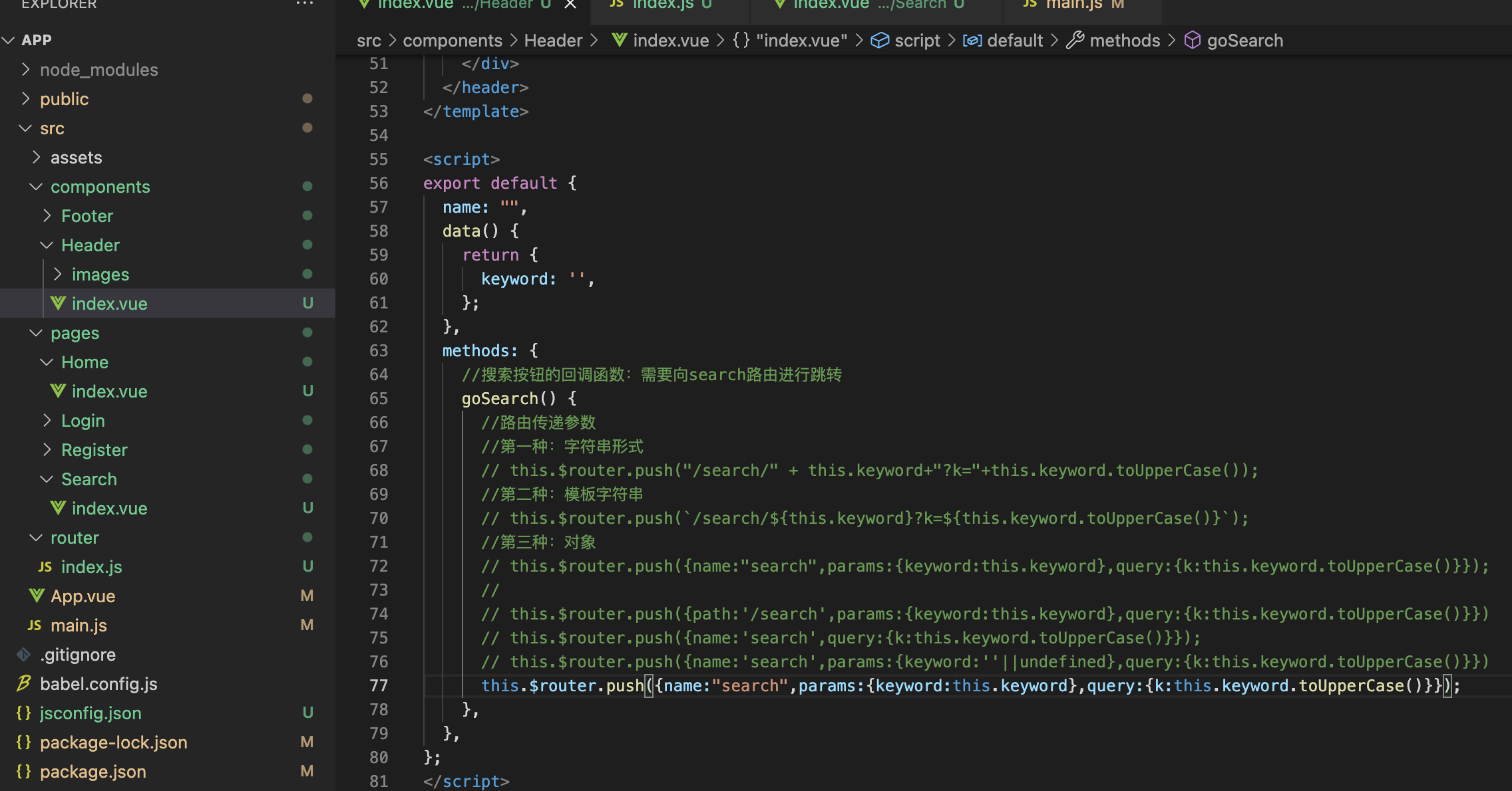 this.$router.push({path:'/search',params:{keyword:this.keyword},query:{k:this.keyword.toUpperCase()}})