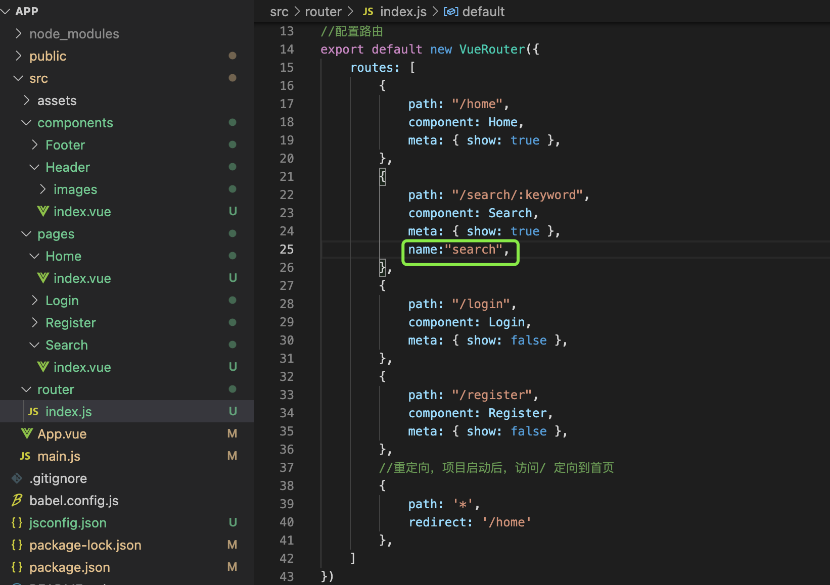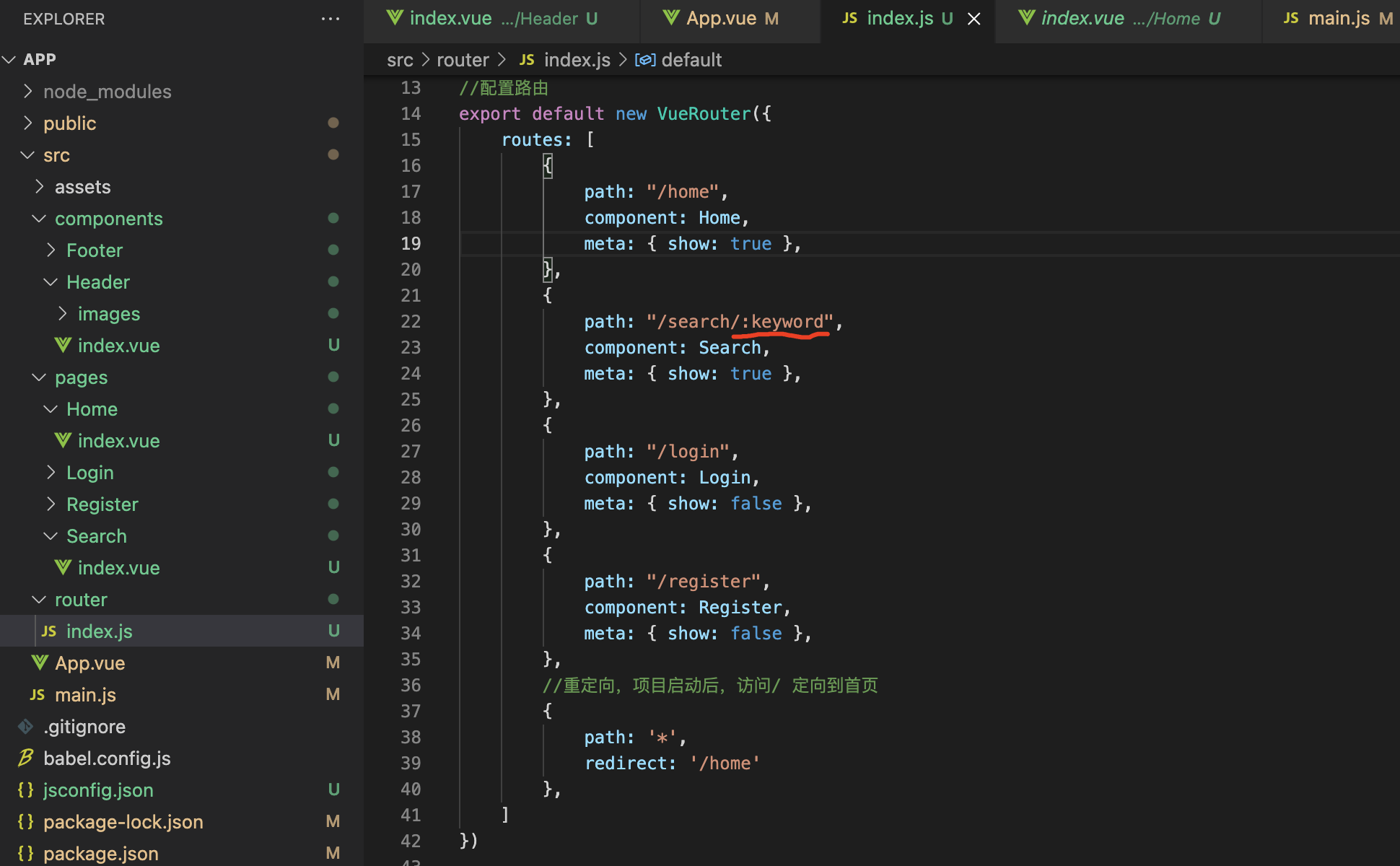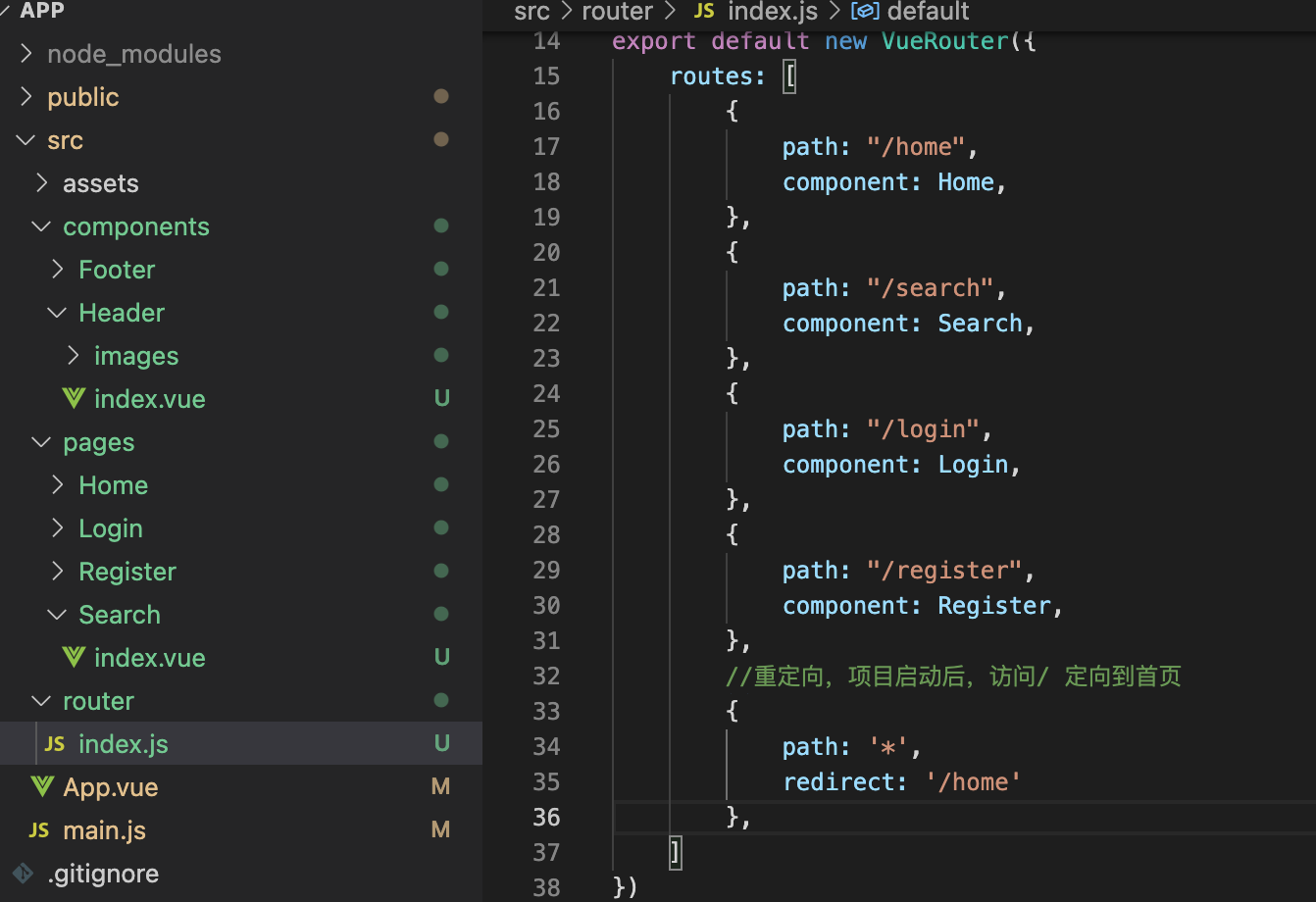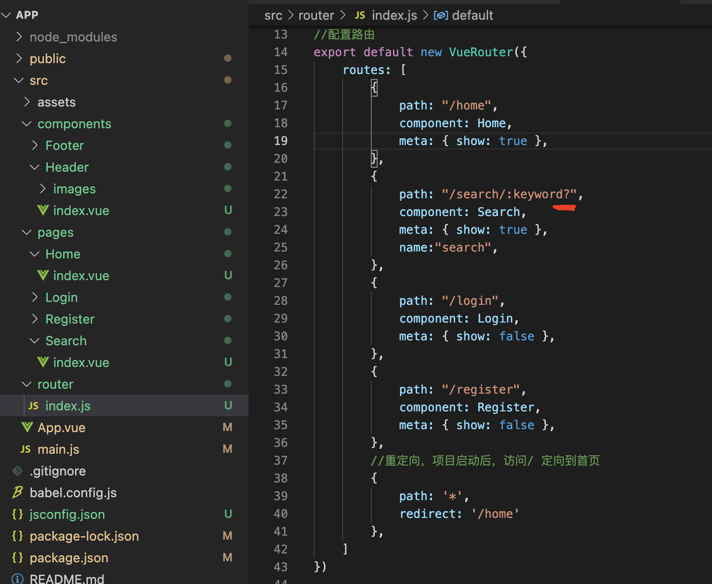 //配置路由的地方 import Vue from 'vue'; import VueRouter from 'vue-router'; //使用插件 Vue.use(VueRouter); //引入路由组件 import Home from '@/pages/Home'; import Search from '@/pages/Search'; import Login from '@/pages/Login'; import Register from '@/pages/Register'; //配置路由 export default new VueRouter({ routes:[ { path:"/home", component:Home, }, { path:"/search", component:Search, }, { path:"/login", component:Login, }, { path:"/register", component:Register, }, ] })