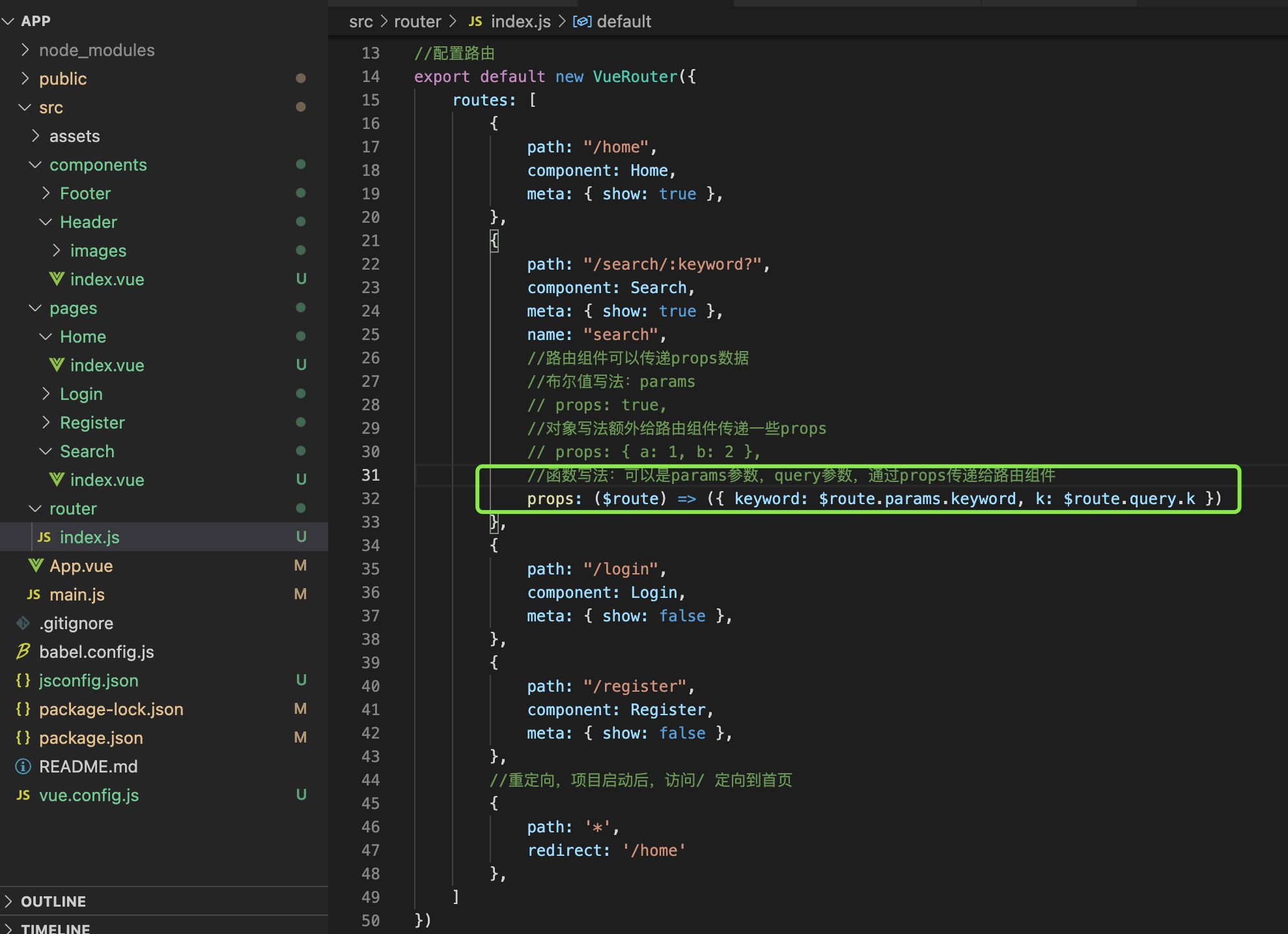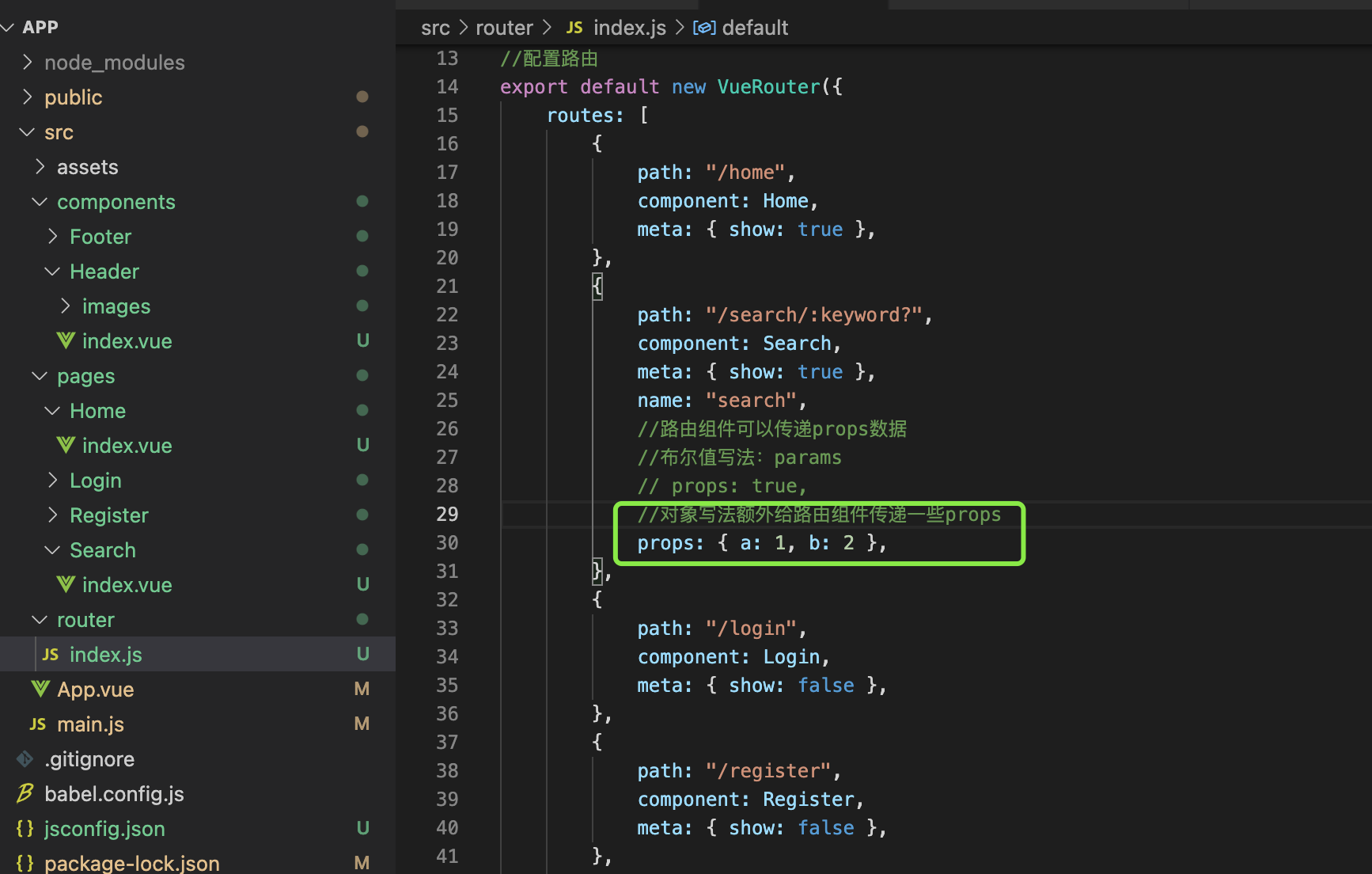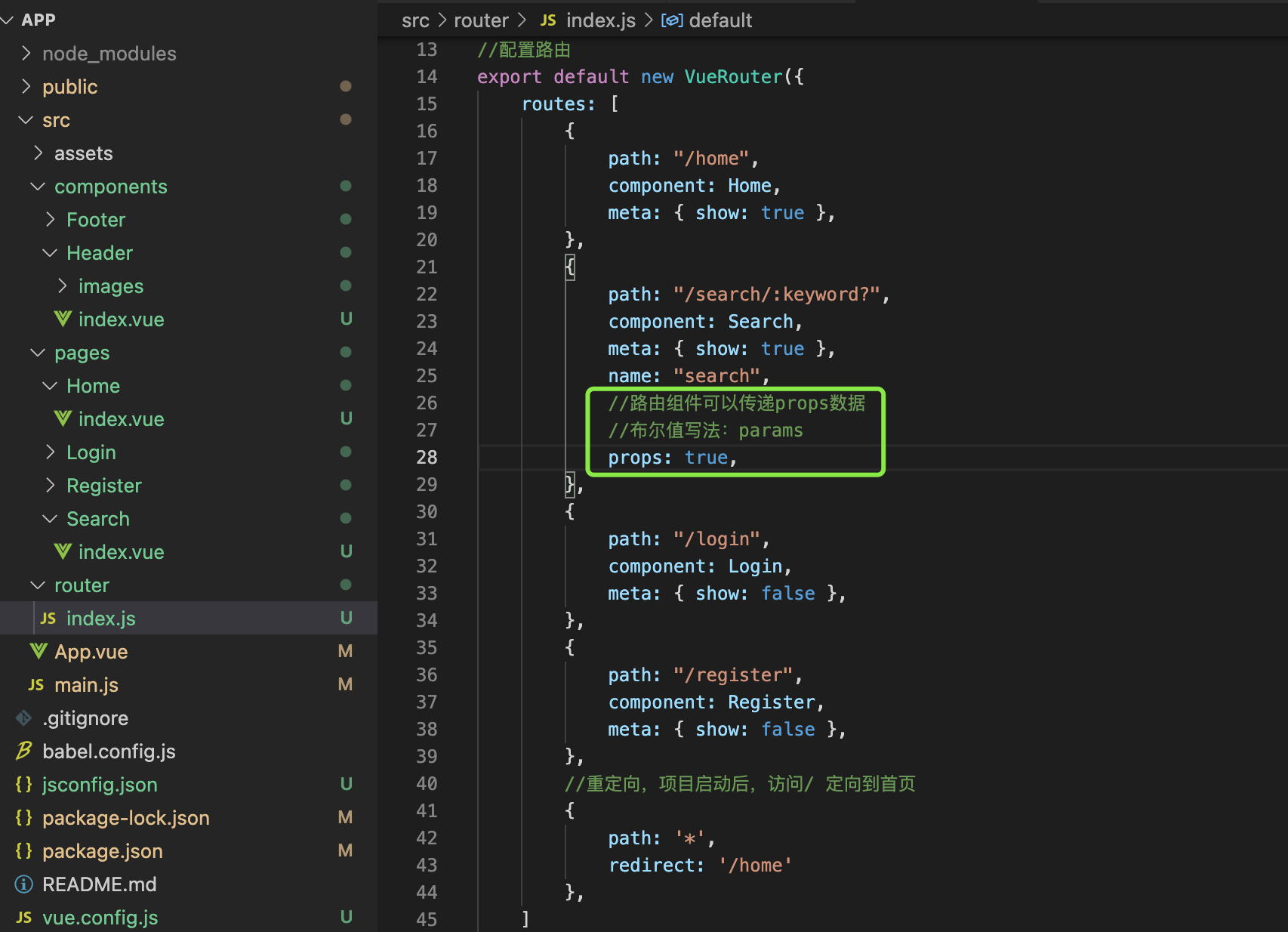 //配置路由的地方 import Vue from 'vue'; import VueRouter from 'vue-router'; //使用插件 Vue.use(VueRouter); //引入路由组件 import Home from '@/pages/Home'; import Search from '@/pages/Search'; import Login from '@/pages/Login'; import Register from '@/pages/Register'; //配置路由 export default new VueRouter({ routes:[ { path:"/home", component:Home, }, { path:"/search", component:Search, }, { path:"/login", component:Login, }, { path:"/register", component:Register, }, ] })