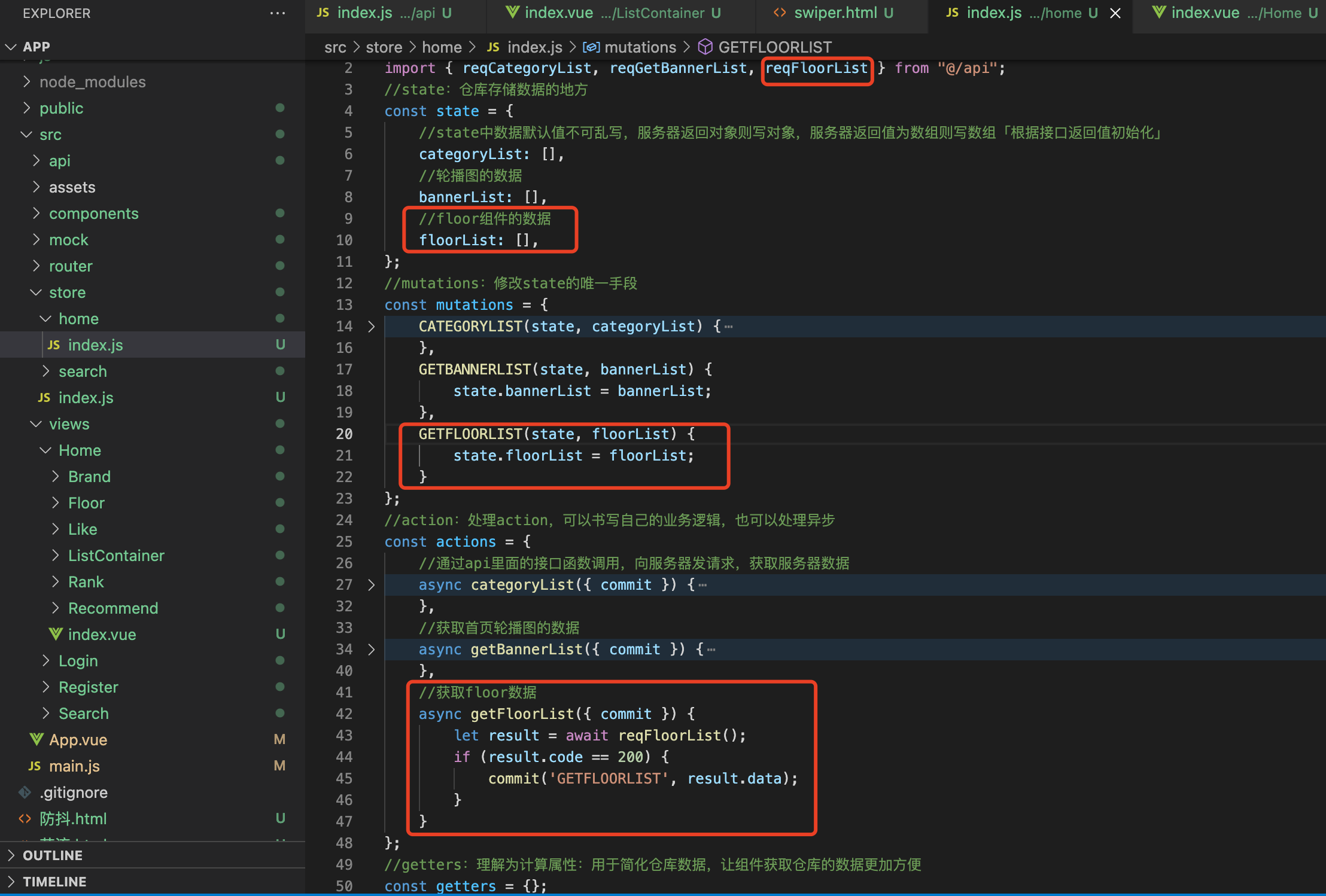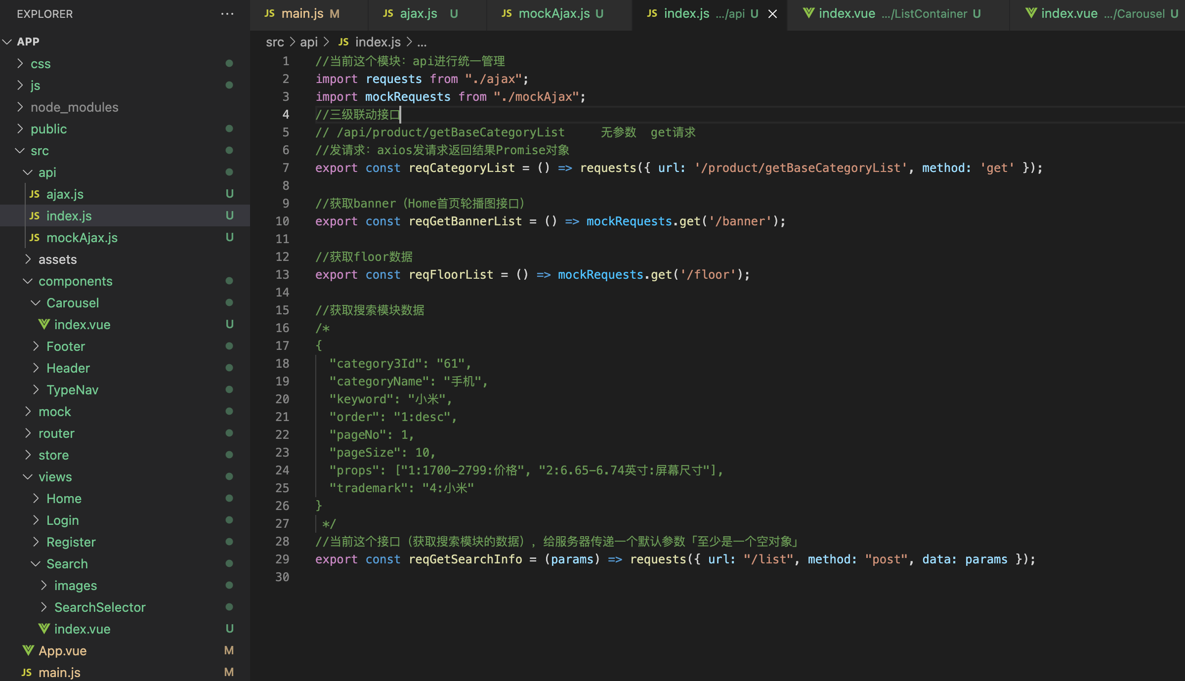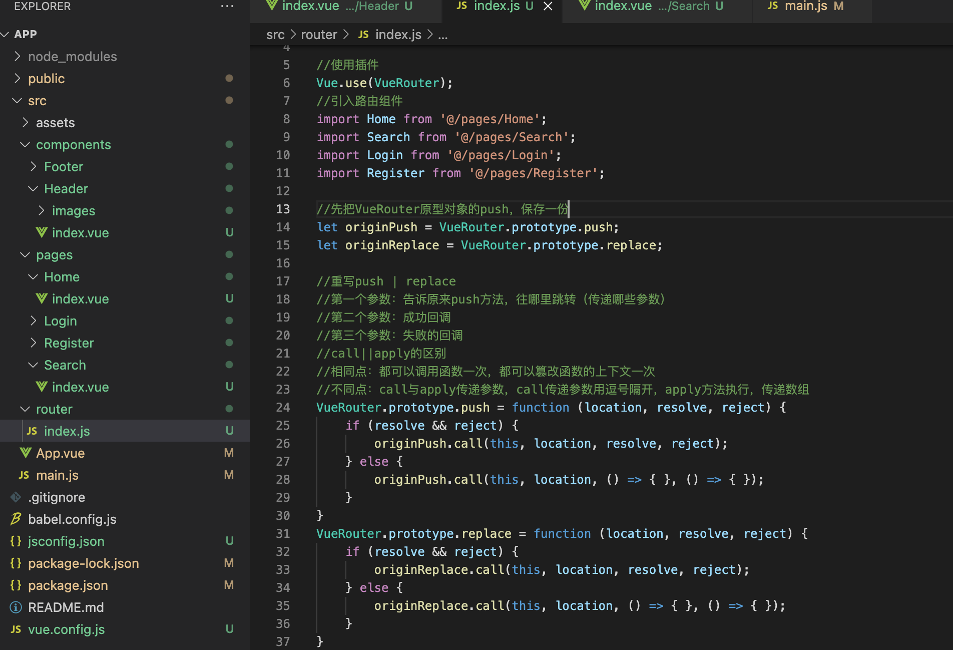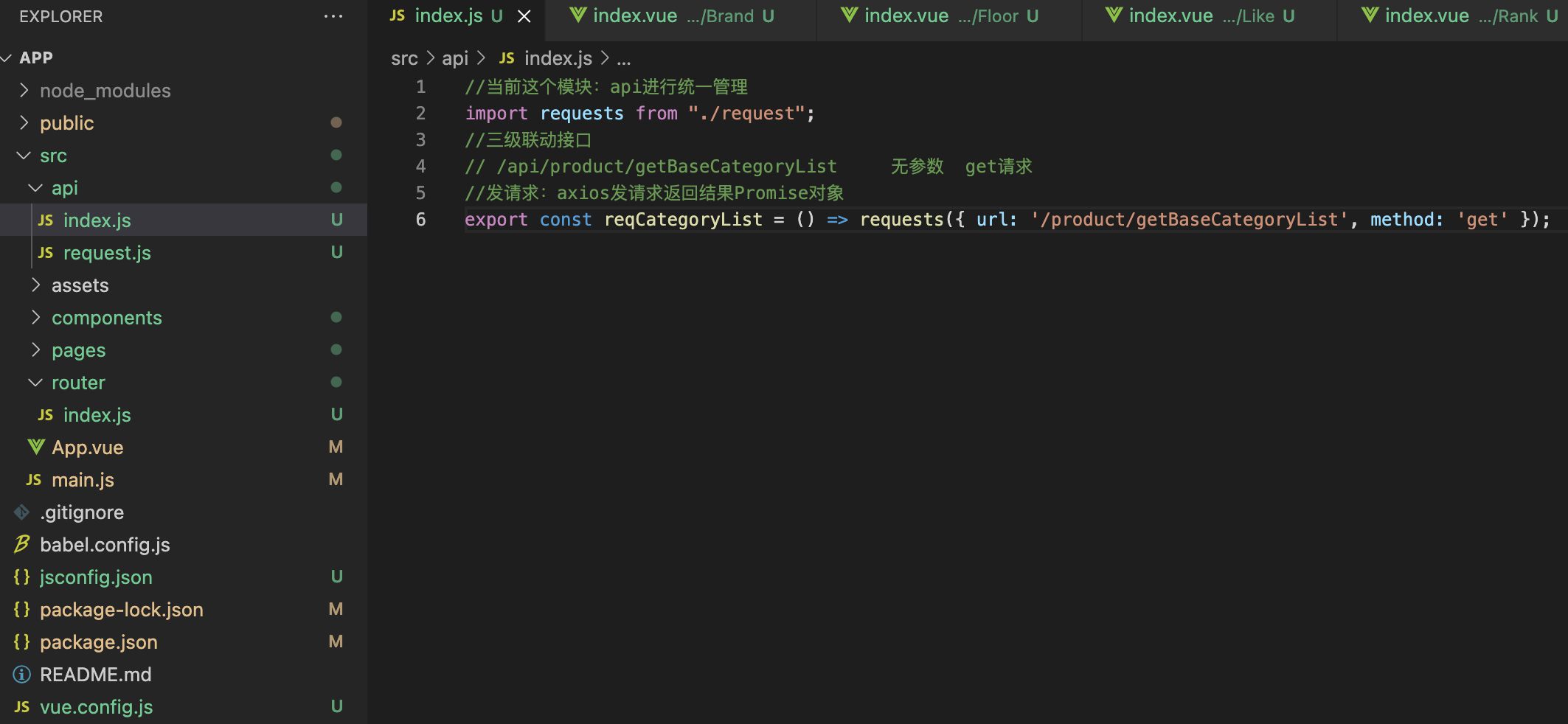 //配置路由的地方 import Vue from 'vue'; import VueRouter from 'vue-router'; //使用插件 Vue.use(VueRouter); //引入路由组件 import Home from '@/pages/Home'; import Search from '@/pages/Search'; import Login from '@/pages/Login'; import Register from '@/pages/Register'; //配置路由 export default new VueRouter({ routes:[ { path:"/home", component:Home, }, { path:"/search", component:Search, }, { path:"/login", component:Login, }, { path:"/register", component:Register, }, ] })