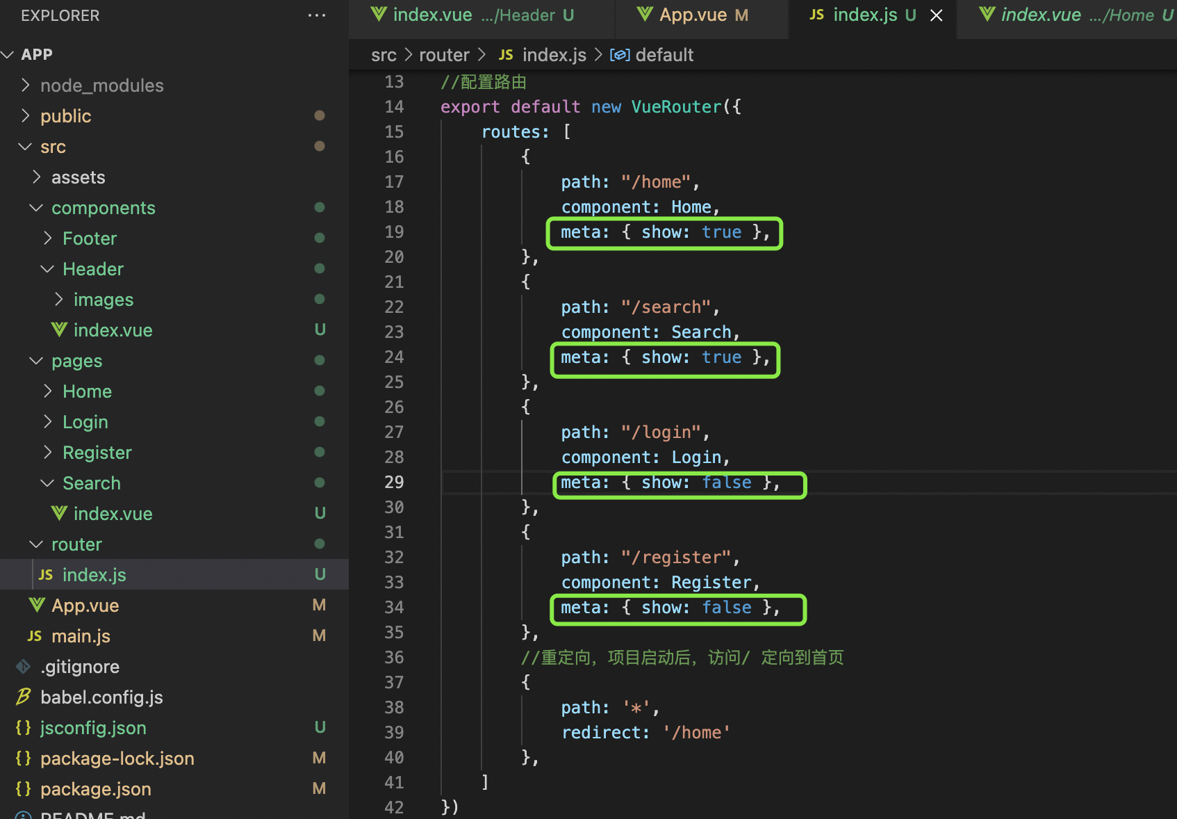 { path: "/home", component: () => import("@/views/Home"), meta: { show: true }, },