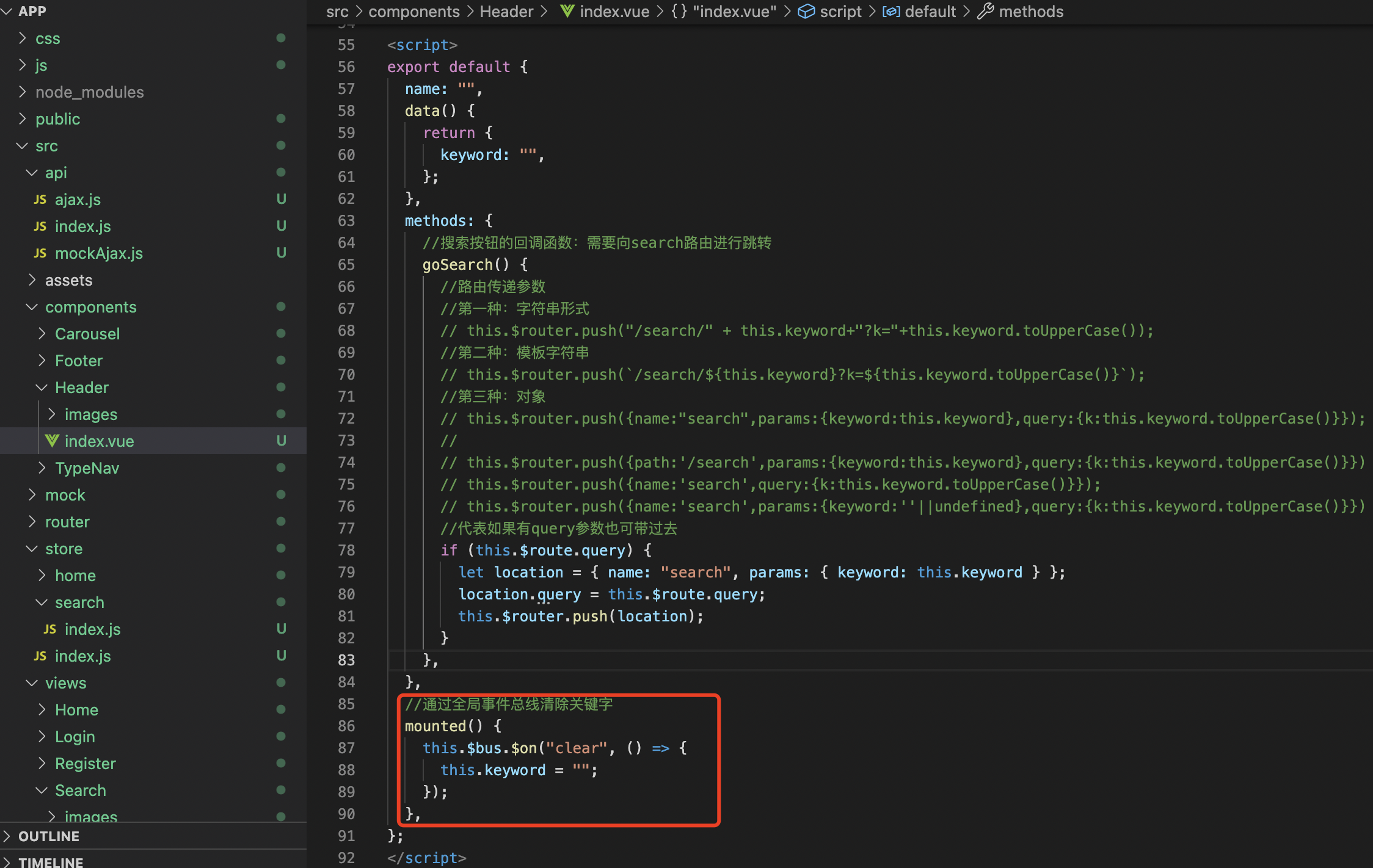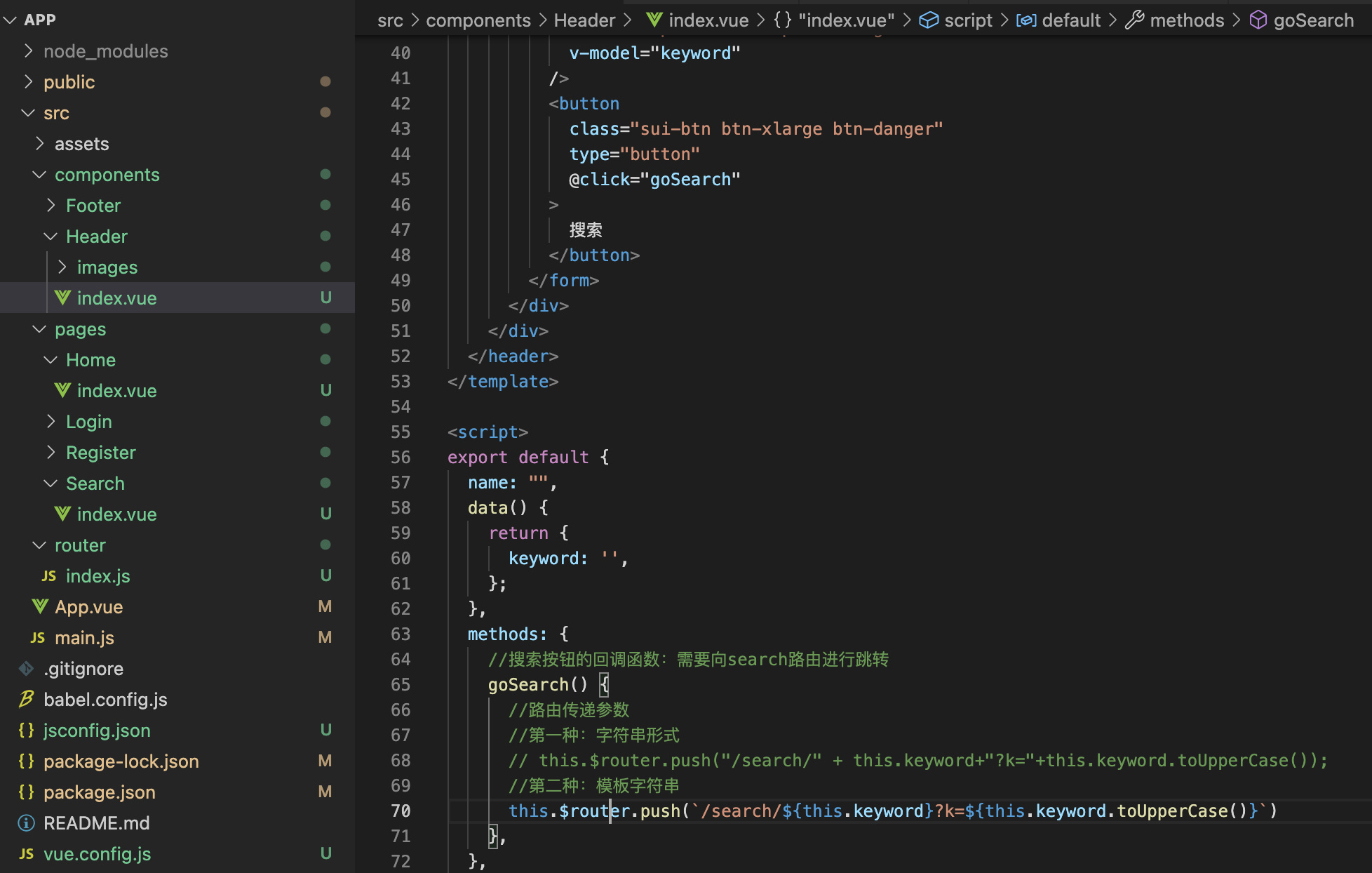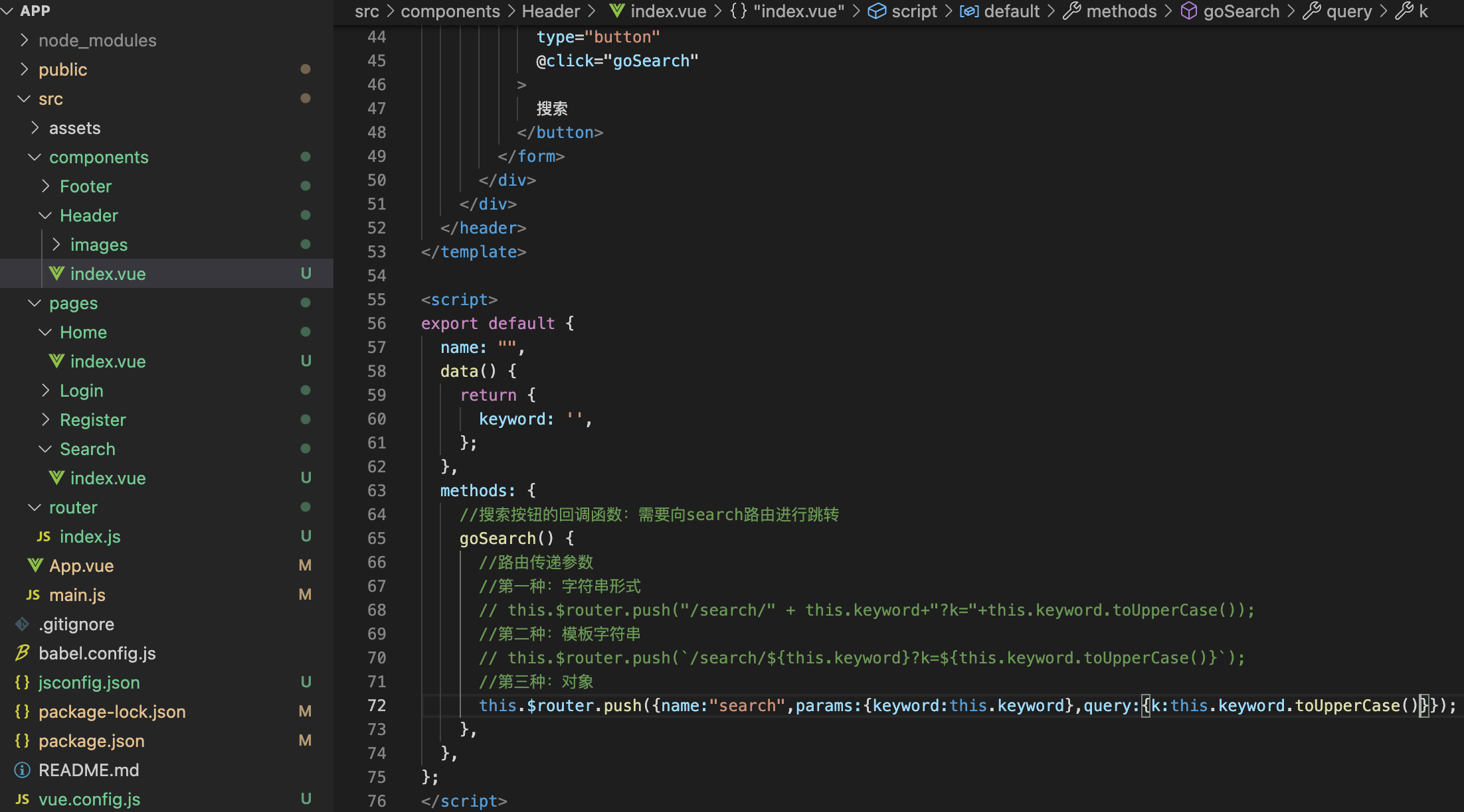 this.$router.push({name:"search",params:{keyword:this.keyword},query:{k:this.keyword.toUpperCase()}})