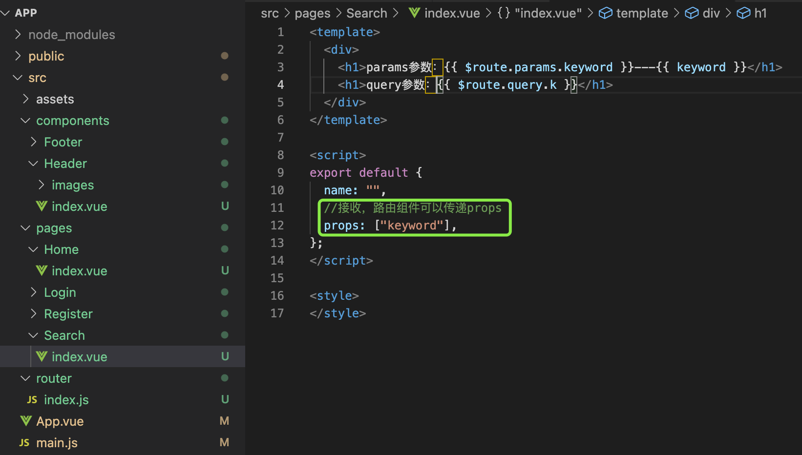 params参数:属于路径当中的一部分,需要注意在路由跳转的时候需要占位
