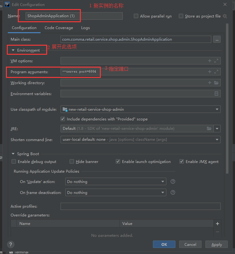 3.编辑弹出窗口edit configuration(指定端口的命令 --server.port=6004,最前面是两个短横岗