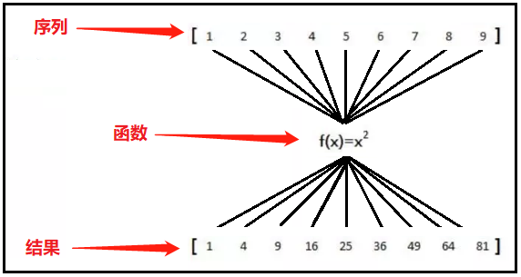 原理解释:上图有一个列表,元素分别是从1-9。map()函数的作用就是,依次从这个列表中取出每一个元素,然后放到f(x)函数中,最终得到一个通过函数映射后的结果。