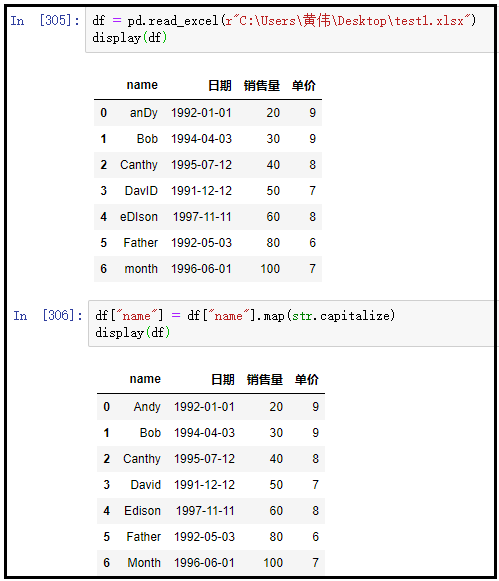 df = pd.read_excel(r"C:\Users\黄伟\Desktop\test1.xlsx") display(df) df["name"] = df["name"].map(str.capitalize) display(df)