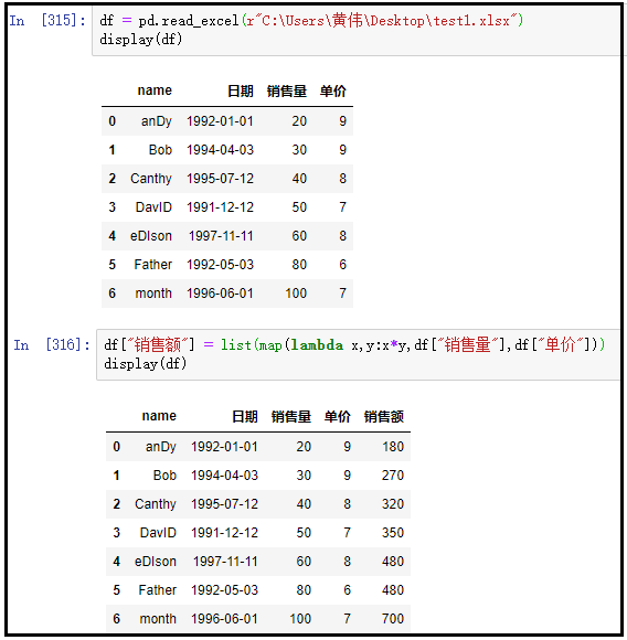 df = pd.read_excel(r"C:\Users\xxx\Desktop\test1.xlsx") display(df) df["销售额"] = list(map(lambda x,y:x*y,df["销售量"],df["单价"])) display(df)