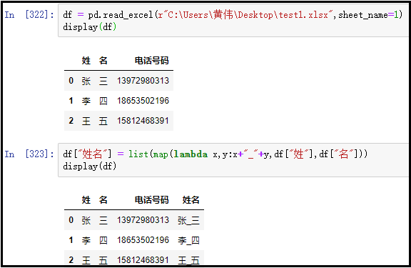 df = pd.read_excel(r"C:\Users\xxx\Desktop\test1.xlsx",sheet_name=1) display(df) df["姓名"] = list(map(lambda x,y:x+"_"+y,df["姓"],df["名"])) display(df)