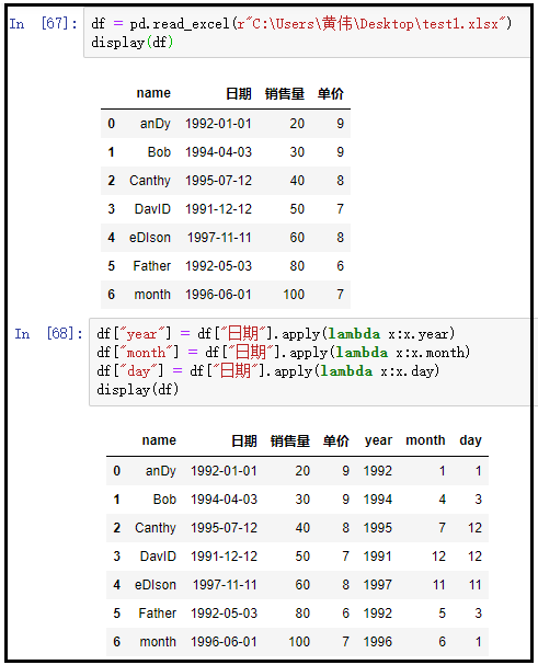 df = pd.read_excel(r"C:\Users\黄伟\Desktop\test1.xlsx") display(df) # 注意:这里的日期列,是时间格式 df["year"] = df["日期"].apply(lambda x:x.year) df["month"] = df["日期"].apply(lambda x:x.month) df["day"] = df["日期"].apply(lambda x:x.day) display(df)