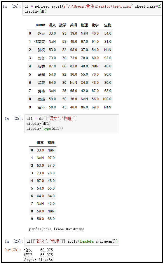 df = pd.read_excel(r"C:\Users\黄伟\Desktop\test.xlsx",sheet_name=2) display(df) df1 = df[["语文","物理"]] display(df1) display(type(df1)) df[["语文","物理"]].apply(lambda x:x.mean())
