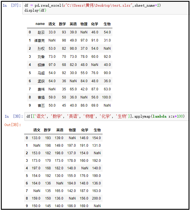 df = pd.read_excel(r"C:\Users\黄伟\Desktop\test.xlsx",sheet_name=2) display(df) df[['语文', '数学', '英语', '物理', '化学', '生物']].applymap(lambda x:x+100)