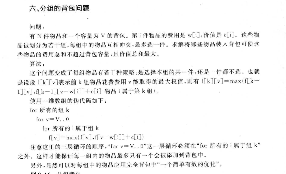 0-1背包问题 dp[i][j]表示前i件物品,体积容量为j的背包所能获得的最大价值 决策是第i个物品选不选; 转移方程 dp[i][j]=max(dp[i-1][j],dp[i-1][j-v[i]]+w[i]); n为物品数量,m为背包体积 for(int i=1;i<=n;i++) for(int j=0;j<=m;j++) if(j-v[i]>=0)dp[i][j]=max(dp[i-1][j],dp[i-1][j-v[i]]+w[i]); 可以发现我们的状态只由上一层前面的状态决定; 于是我们可以从后面枚举体积这样我们的状态转移还是正确的; 这样做是为了优化空间 for(int i=1;i<=n;i++) for(int j=m;~j;j--) if(j-v[i]>=0)f[j]=max(f[j],f[j-v[i]]+w[i]); 完全背包指的是每件物品可以无限装入背包; 决策是否使用第i件物品,如果使用我们的状态是由dp[i][j-v[i]]转移过来 因为物品i还有可能会被选; dp[i][j]=max(dp[i-1][j],dp[i][j-v[i]]+w[i]); 直接优化方程 //转移是从上一阶段的同v或者这阶段的<v转移过来,所以体积从小到大枚举 for(int i=1;i<=n;i++) for(int j=0;j<=m;j++) if(j-v[i]>=0)f[j]=max(f[j],f[j-v[i]]+w[i]); 多重背包就是每件物品由次数限制; 这时候我们考虑二进制拆分; 二进制拆分有个性质是000001111它拆成1.2.4.8可以组成1-15的数 对于每一位我们可以那4个1我们可以选与不选一共16种组合 除去都不选的0000还有15种组合对应1-15,如1010表示拆分的8和2选进背包 用换元思想理解; 这样我们从最低位对一个数的二进制进行拆分直到当前位不能被拆而独立存在 如某物品数量为10;我们可以拆1 2 4发现8不能当作第四物品,所以第四件10-1-2-4=3独立存在 int v[100000],w[100000],p=0; for(int i=1;i<=n;i++) { int t=1,s=a[i]; while(s>=t) { v[++p]=t*v[i]; w[p]=t*w[i]; s-=t; t*=2; } if(s)//如果还有独立生成一件换元物品 { v[++p]=s*v[i]; w[p]=s*w[i]; } } //后续就是0-1背包数量为p,这里为了习惯我用n替换p; for(int i=1;i<=n;i++) for(int j=m;~j;j--) if(j-v[i]>=0)f[j]=max(f[j],f[j-v[i]]+w[i]);