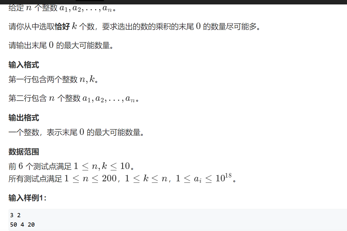 1 #include<bits/stdc++.h> 2 using namespace std; 3 int dp[205][5050]; 4 int v[205],w[205]; 5 int n,k; 6 int main() 7 { 8 //cout<< log(1e18)/log(5)<<endl;25 9 memset(dp,-0x3f,sizeof(dp)); 10 dp[0][0]=0; 11 scanf("%d%d",&n,&k); 12 for(int i=1;i<=n;i++) 13 { 14 long long t; 15 scanf("%lld",&t); 16 while(t%5==0){v[i]++;t/=5;} 17 while(t%2==0){w[i]++;t/=2;} 18 } 19 20 for(int i=1;i<=n;i++) 21 for(int j=k;j;j--) 22 { 23 for(int c=i*25;c>=v[i];c--) 24 dp[j][c]=max(dp[j][c],dp[j-1][c-v[i]]+w[i]); 25 } 26 27 28 int ans=0; 29 for(int i=1;i<=5050;i++) 30 ans=max(ans,min(dp[k][i],i)); 31 cout<<ans<<endl; 32 return 0; 33 } 34 35 /*f[i][j][c5]表示i个数取j个5的幂个数为c5时2的最大幂次; 36 f[i][j][c5]=max(f[i-1][j][c5], f[i-1][j-1][c5-v[i]]+w[i]);*/