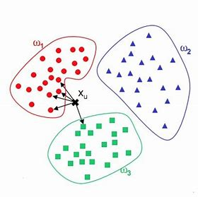 如图1中所示,Xu 是我们的待测样本点,此时我们在其中设K为5,也就是从Xu 出发需要计算到各个点的距离再求出距离最短的前5个点,从而可从图中看出有4个点分布在ω1中,一个点分布在ω3中,根据多数表决原则,P(ω1)=0.8,P(ω2)=0,P(ω3)=0.2,因此KNN模型将认为该Xu样本点隶属于ω1类。