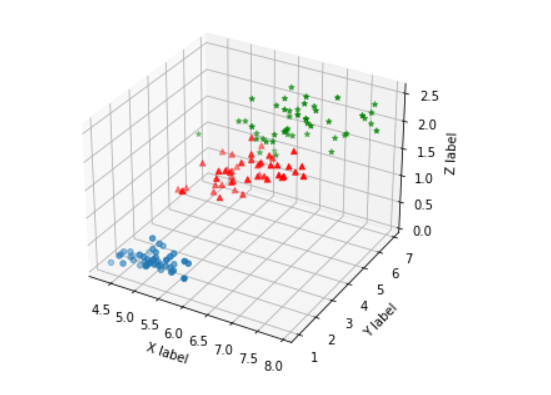 ax.scatter(iris_1[:,0],iris_1[:,1],iris_1[:,2],c='r',marker='^')