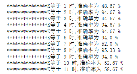 print("***************K等于",k,"时,准确率为",round(accurate*100,2),'%')