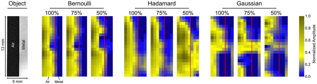 Since the mask properties are of such importance for the image quality and all published work in this area has so far not focused on different mask types in an unintentional compressive case. Only Bernoulli and Hadamard masks are able to produce a reasonably good image of the single metallic edge. The Gaussian masks produce a THz representation of the edge that shows already significant distortions in the case where the number of measurements is equal to the number of pixels(100%). As can also be seen in Fig.2 only the Bernoulli masks show good compression results of the metallic edge even when only random 50% of the measured values are used for reconstruction. According to this analysis, only the pseudo-random Bernoulli masks exhibit potential for compressive imaging.