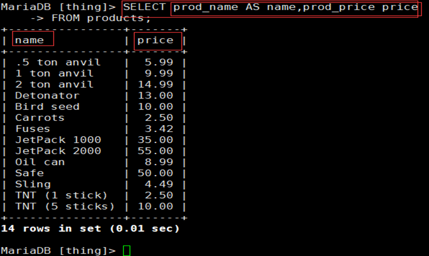 如:将检索prod_name和prod_price字段分别设置为别名name和price