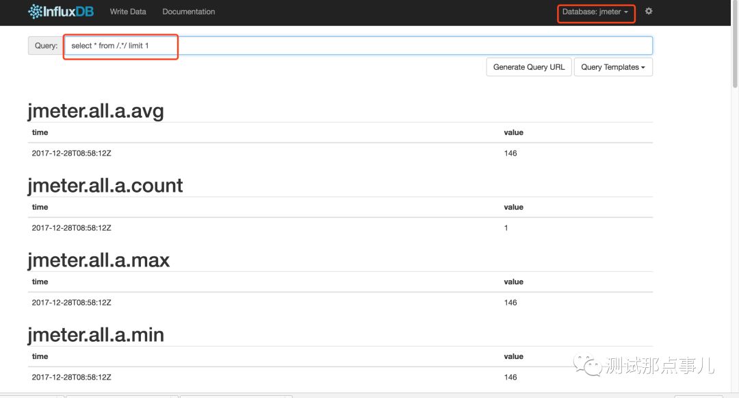 如果成功,InfluxDB的页面上查看数据,数据源选择jmeter, 在输入框中输入select * from /.*/ limit 1,点击回车,如图: