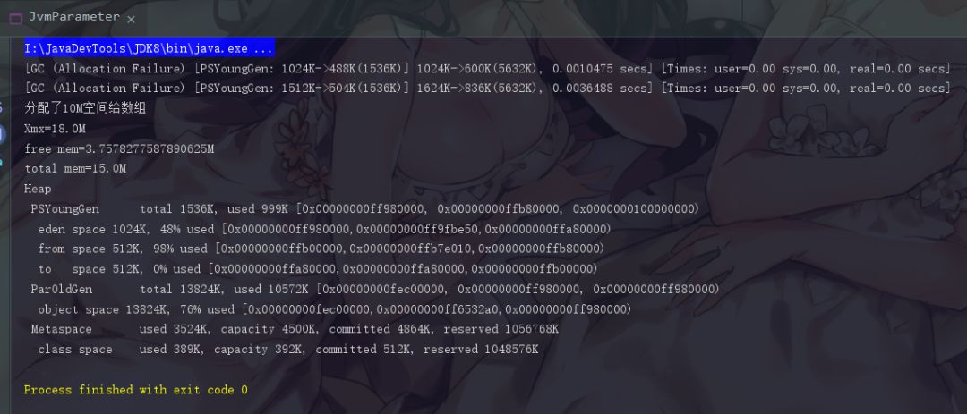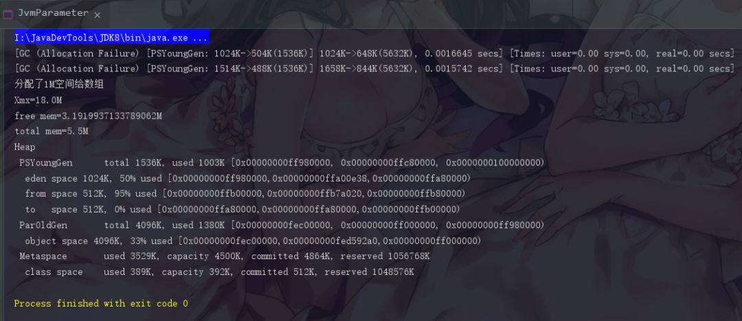 这里GC弹出了一个Allocation Failure分配失败,这个事情发生在PSYoungGen,也就是年轻代中