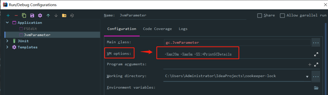 注意:此处设置的是Java堆大小,也就是新生代大小 + 老年代大小