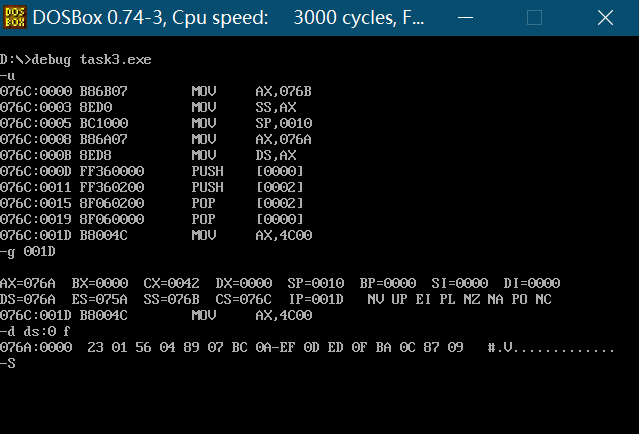 1 assume cs:code, ds:data, ss:stack 2 data segment 3 dw 0123h, 0456h, 0789h, 0abch, 0defh, 0fedh, 0cbah, 0987h 4 data ends 5 6 stack segment 7 dw 0, 0, 0, 0, 0, 0, 0, 0 8 stack ends 9 10 code segment 11 start: mov ax,stack 12 mov ss, ax 13 mov sp,16 14 15 mov ax, data 16 mov ds, ax 17 18 push ds:[0] 19 push ds:[2] 20 pop ds:[2] 21 pop ds:[0] 22 23 mov ax,4c00h 24 int 21h 25 26 code ends 27 end start
