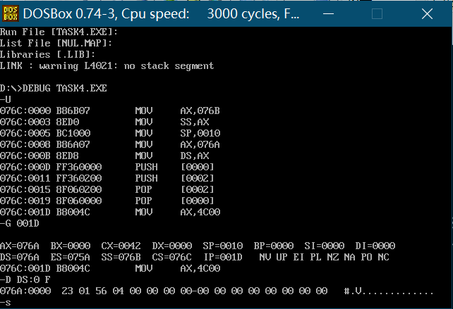 CPU执行程序,程序返回前,cs=076c、ss=076b、ds=076a