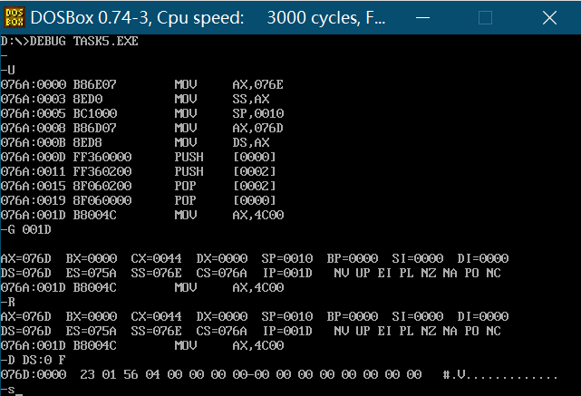 - CPU执行程序,程序返回前,cs=076a、ss=076e、ds=076d