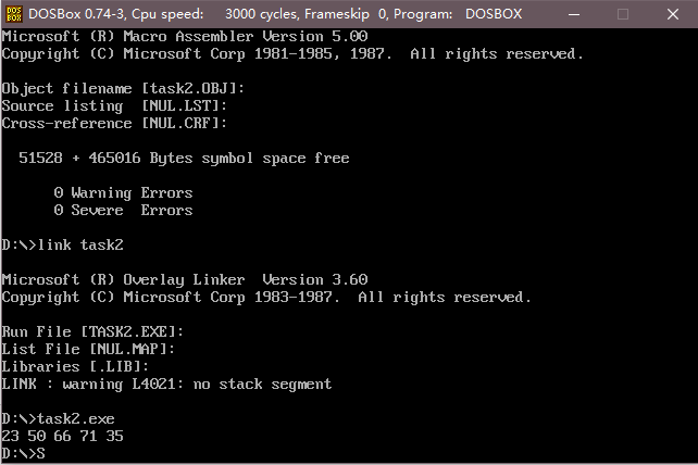 使用masm、link工具汇编、链接的命令行及运行结果截图: