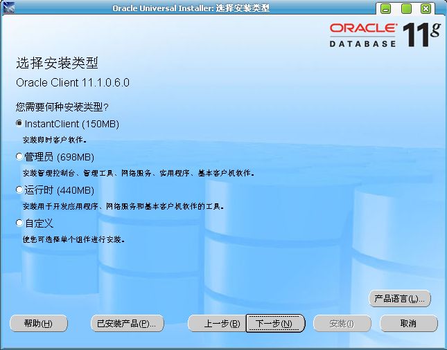 从网上下载oracle11g客户端,安装后弹出下列选择框,当要在客户端开发连接oracle11g数据库的程序。应该选择下面的运行时,看它的提示:安装用于开发应用程序,网络服务等。