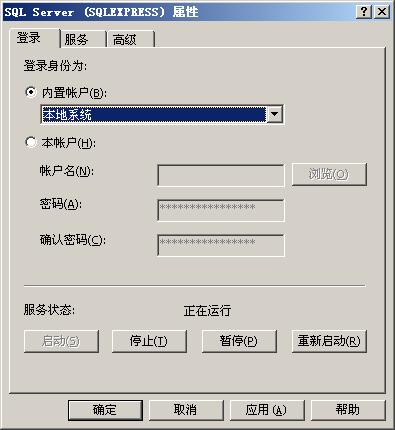 在内置帐号处,把“网络服务”改成“本地系统”,重新启动SQL Server 2005 Express 后,再附加(Attach)数据库一切正常。