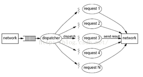 应用程序开发中经常会采用多线程模型,其工作原理一般是对于每一个request,dispatcher会为其创建并分配一个线程。该线程负责这个请求的处理。这种模式的有点事处理逻辑清晰,容易开发,处理粒度是整个完整的处理流程。