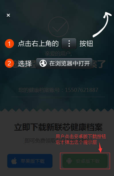 这是因为我们所分享的链接/APK下载地址,微信,用户手机默认浏览器之间没有跳转接口,所有微信无法唤醒用户手机默认浏览器完成自动跳转。我相信做微信营销的都明白,用户并不会因为在微信中看了我们的产品简介之后对产品产生购买欲,只有在打开链接,了解了产品详情之后才会刺激消费。所以如果不能实现自动跳转,在微信营销中就会大大降低了转化率。大批用户因此流失,若不解决此问题,做微信营销势必事倍功半。